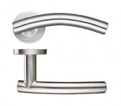 A 19mm arched "T" lever door handle with a push on rose in Grade 201 satin stainless steel. Supplied in pairs complete with spindle and bolt-through fixings.